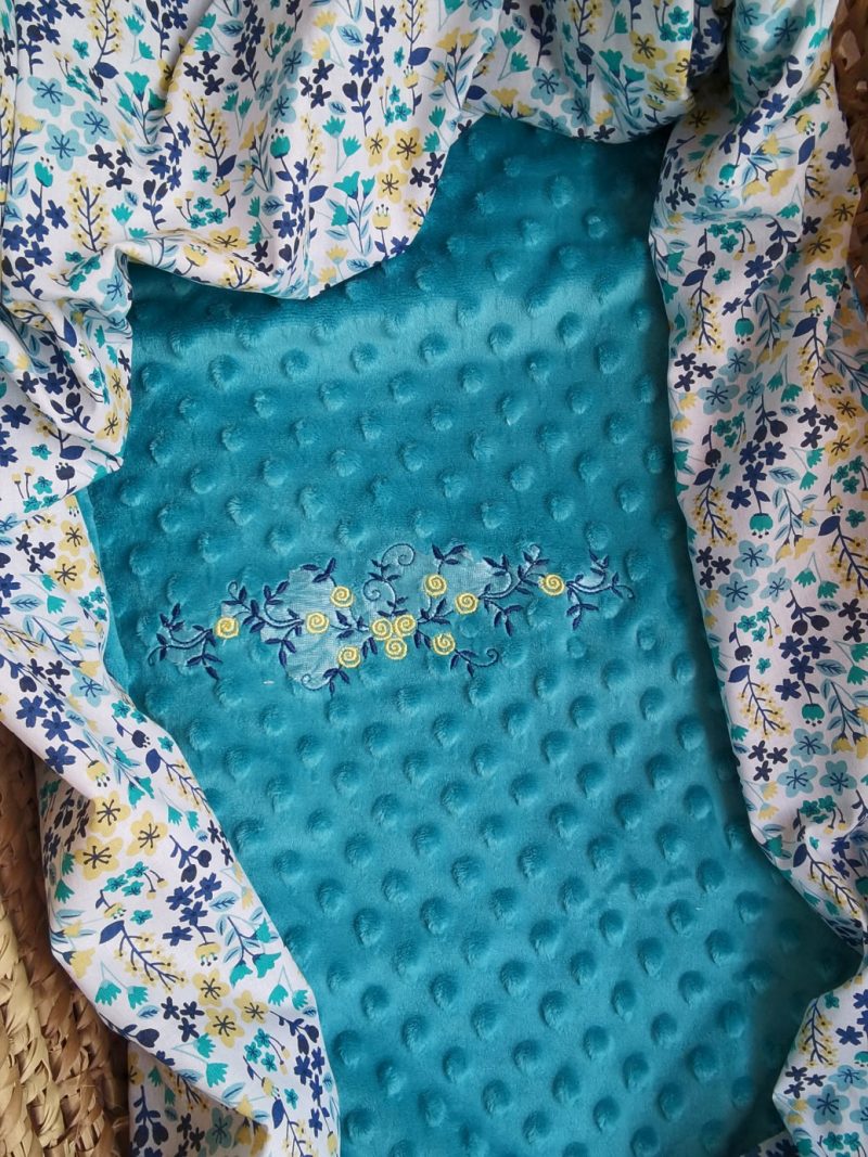 - Tissu1 – face avant (polaire – 100% polyester): Minky Bleu Turquoise (où sera brodé le prénom)
